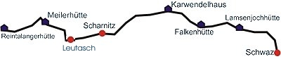 Erster Tag: Zunächst führt der Weg durch Wald und über Almwiesen, wird nach der Stallenalm, welche sich zu einer Brotzeit anbietet, aber zunehmend felsig. Die Lamsenjochhütte bietet sich als Ausgangspunkt mehrerer Gipfeltouren an. Ausgebaute Kletterrouten und ein Klettersteig zur Lamsenspitze sind vorhanden. Zweiter Tag: Der Weg bietet herrliche Blicke ins Rißtal und auf die Lalidererwände. Die großen Ahornbäume und der Brunnen am Hermann von Barth-Denkmal laden zum Verweilen ein. Sowohl von der Falkenhütte als auch vom Karwendelhaus sind "Gipfeltouren" (für Bergsteiger) möglich. Dritter Tag: Der Weg folgt dem Karwendelbach und bietet kurz vor Scharnitz einen schönen Blick in die Karwendelklamm. Vierter Tag: Auf diesem Teil sind Trittsicherheit und Schwindelfreiheit nötig. Im oberen Bereich ist der Weg ausgesetzt. Fünfter Tag: Eine gemütliche Tour, meist bergab mit vielen schönen Eindrücken. |